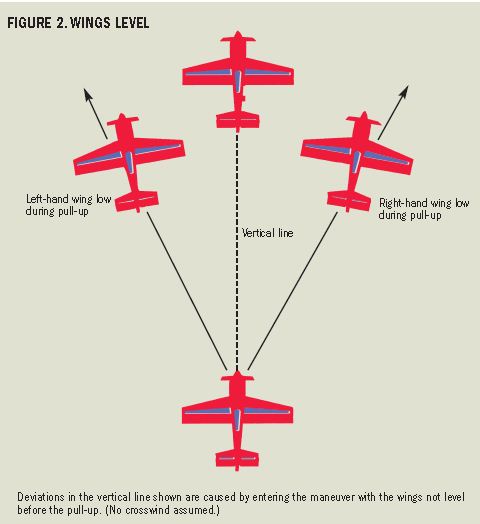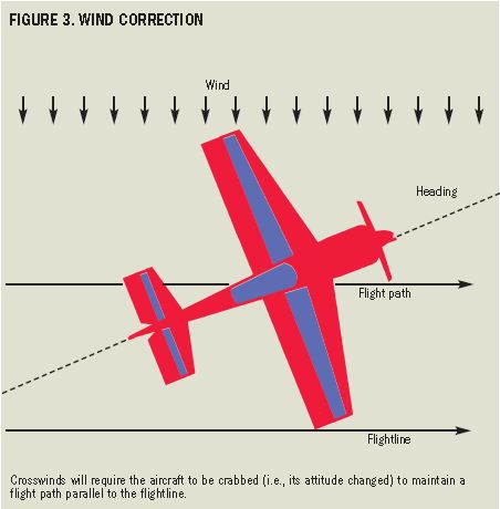 Wind correction is another factor that will influence straight and level flight and your vertical lines. (Note: “wind correction” means that you must lean the plane’s heading slightly into the wind to keep the plane’s flight path parallel to the runway and perpendicular to the ground during a vertical climb.) If the plane is crabbed during a vertical entry, it will immediately lean toward the direction of crab. You may need to take some of the crab out of the plane with rudder immediately before the pull. (I emphasized the word “some” to signify that there is no hard-and-fast rule concerning how much to remove.) A certain amount of crab-angle wind correction should be maintained to keep it parallel to the runway. Each plane will act differently depending on its weight, the length of its tail moment and the amount of crosswind velocity. The only way to find how much crab angle you’ll need to remove is by practicing. It may seem simple, but I can’t over-emphasize how important it is to master straight and level flight—for aspiring aerobatic pilots and seasoned veterans, as well. Think of it as the glue that holds your sequence of maneuvers together.
