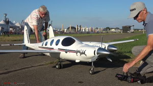 Check out this one-of-a-kind model of a one-of-a-kind aircraft! Designed by Erwin Schmelzer and flown here by Gerhard Grambow, this unique Rutan Model 202 Boomerang has a 125.9-inch wingspan and is powered by two Saito FG 57 TS four-strokes. The composite fuselages, cowlings, tips, vertical stabilizer were made using 3D-printing and molds. The wings and horizontal stabilizers are made of Styrodur (insulation board), carbon-fiber and Abachi sheeting. Erwin notes, “The construction time was two and a half years, but with a few interruptions. It is difficult to estimate the time required, but it was around 700 hours each time. Only a high-quality 3-view and many photos from the Internet were available for the construction.” This model is, like the original, the only existing aircraft of this type. It’s a stunner!
