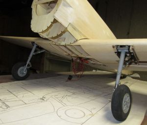 Here early in the construction of the Skyraider wing, the gear, along with a 4-inch Top Flite Corsair style wheel, is placed over the plans. This showed whether the gear would clear the main wing spar, which it does. But it also showed that the 148E set was wider than the reduced gear drawing on the wing top view. This showed that we would have to adjust the rib spacing while building the wing.