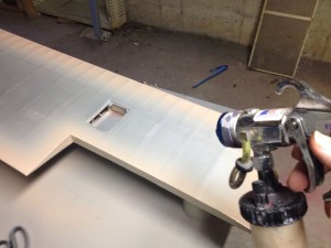 For the larger surfaces I shoot them with paint while horizontal blocked up on my work/paint table. I go over all the edges first and then apply paint to the rib tapes. I then fill in one coat with span-wise coats followed by chord-wise coats. I apply two coats of each color with about an hour drying time between each application.