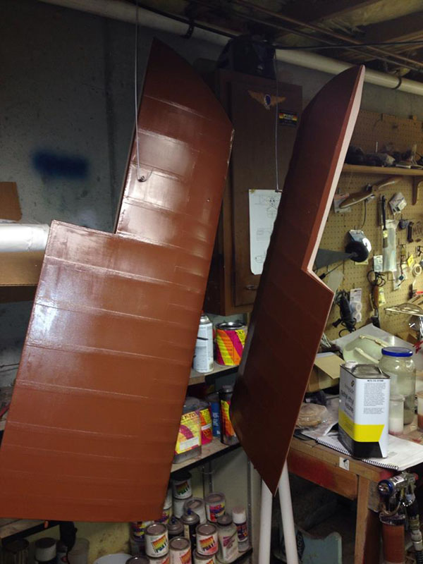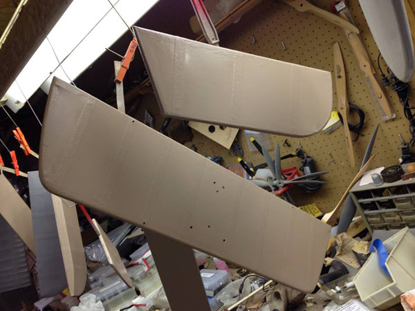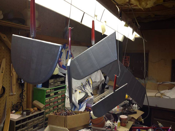 Here are the tail surfaces with silver undercoat, hung up to dry between coats.
