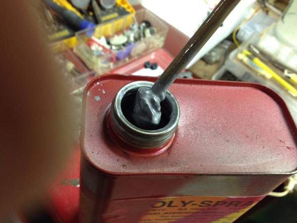 Next comes the Poly Spray Silver undercoat. It is very heavily pigmented with aluminum powder and needs to be completely mixed and reduced before spraying with your gun. It is best to use a wood dowel to stir up the settled pigment from the bottom of the can.