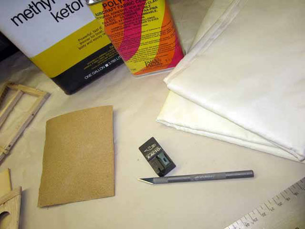 I really enjoy the wing covering process as it impresses me just how much the fabric strengthen and stiffens the wing panels. Just like the fuselage, the first step is to sand the structure smooth and clean up any dust with a tack cloth. Make sure your work surface also is clean and get all your supplies ready. These include the Stits Lite fabric cut oversize for the wing panel, the Poly Tak adhesive, MEK solvent (Be sure to use Hand cream for protection from the chemicals), quality brushes and lots of #11 X-Acro blades for your hobby knife.