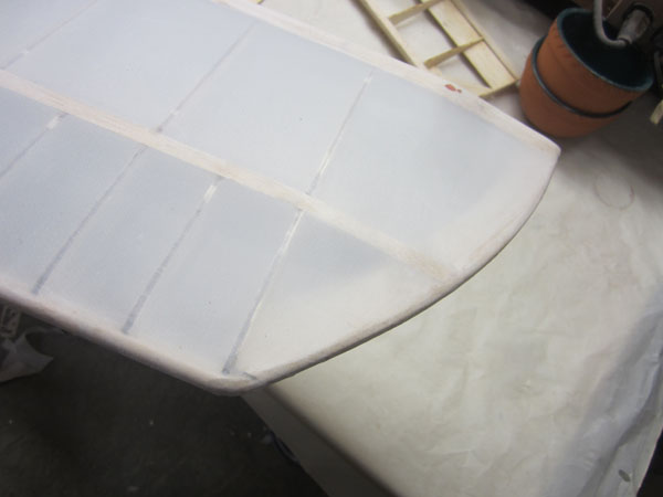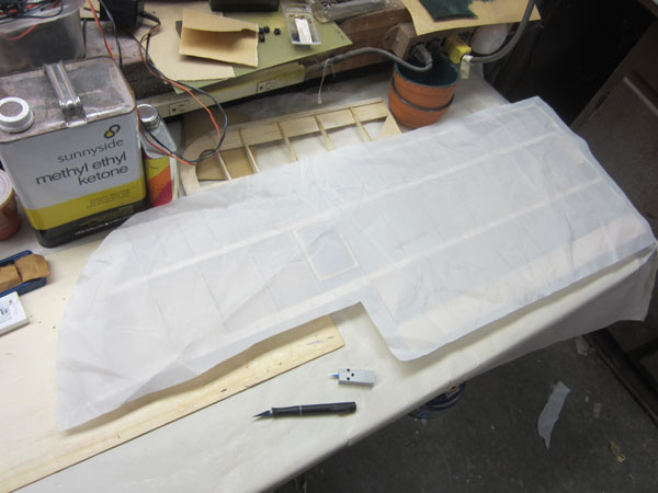 Start by applying a coat of Poly Tak adhesive all around the outer edges of the wing panel and let dry. Now cut the fabric to the rough size for the part. I make it about an inch oversize all the way around. Be sure to have a clean work surface. I use drafting vellum as I have a large supply of it.
