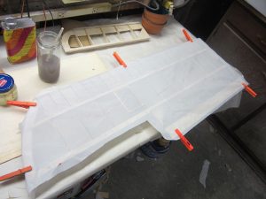 Here’s the completed wing panel. Note there are no wrinkles. You have to remove all the wrinkles before shrinking the fabric tight with your covering iron. If you try to remove wrinkles with heat, the fabric will loosen after it has been painted and finished.