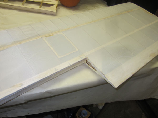 Here you see the wing panel with all the edges bonded down. For a neat appearance I apply another coat of glue to underside of the fabric along the edges and then trim the access away. I then press the fabric down while the glue is still wet to seal it down. Straight neat edges give the model a professional neat appearance.