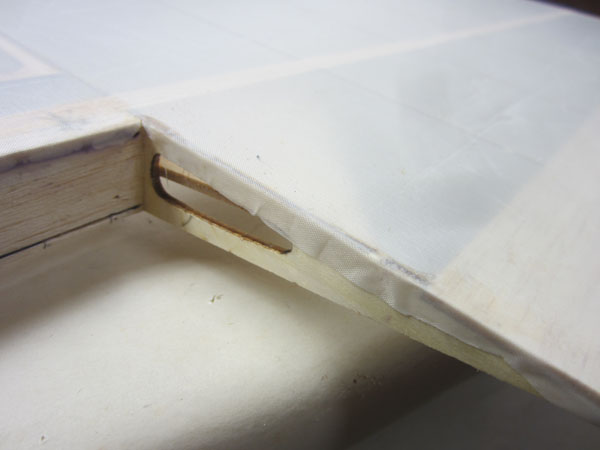 Here is a close up of the edge along the aileron cutout area. Before covering the underside of the panel, I use the covering iron set at 225 Degrees F. to seal and press the edges down completely. Then the whole process is repeated for the second side.