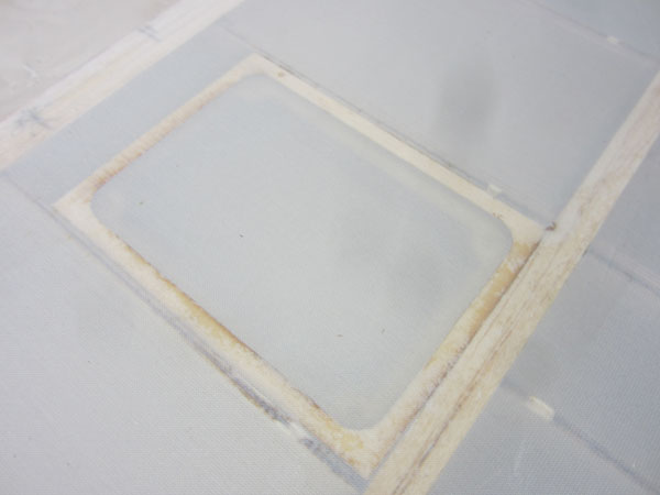 Here is the hatch opening for the aileron servo. It too must be sealed down tightly before cutting the area open. A trick here is to brush MEK through the fabric (after it has been shrunk tight), to reactivate the adhesive around the opening. Then use your fingers to smooth the fabric down into place until the gue dries again.