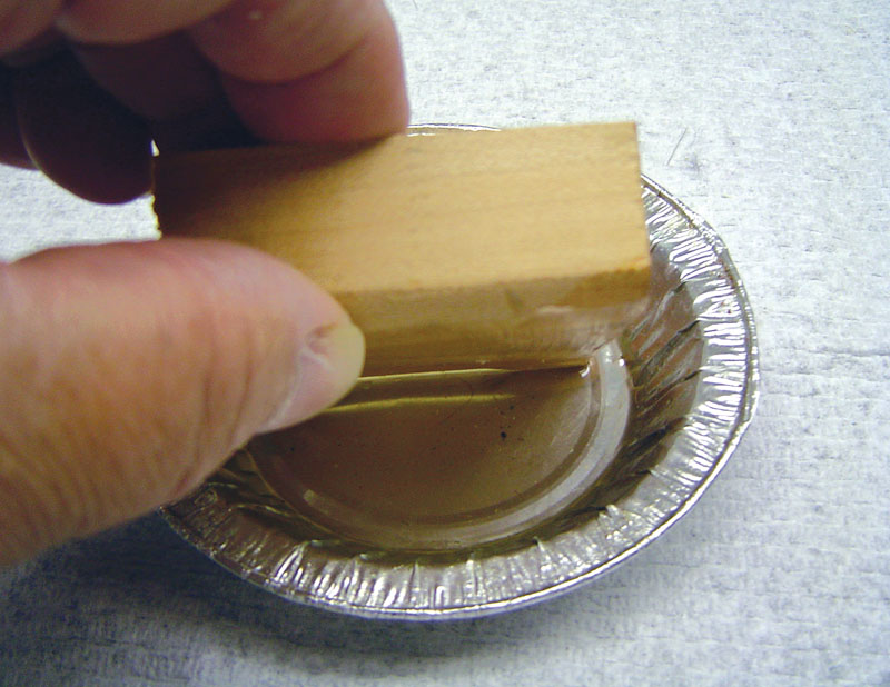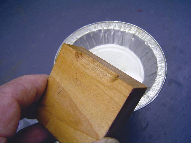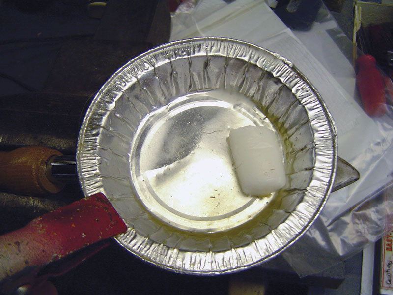 I coated the mold with wax to act as a releasing agent so that the epoxy would not stick to the mold. I melted some candle wax in a disposable aluminum foil dish simply by placing the dish on top of my covering iron. I turned the iron to full power and held it in a bench vise, then placed the dish filled with ordinary sealing wax on top. Once the wax had melted, I dipped the wooden forming mold into the melted wax to coat the surface. I did this several times until the surface was smooth and completely sealed.