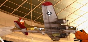 The model was built from Don Smith plans and is about 1:9 scale. A laser cut kit was purchased to reduce the time required for construction since the model shop is only open for about three days a week. Hence, the long build time by the three or four volunteer modelers working on the B-17. Don and the rest of the builders took great pride in modeling the “Outhouse Mouse”, a real life bomber that flew 125 missions over Europe, with 10 missions over Berlin, (shown in red on the mission markings). The model is unusual in that is displayed in-flight with its bomb bay doors open and three 500 lb. bombs being dropped. The completed model weighs 45 pounds and is painted with custom mixed latex house paint thinned with windshield washer fluid. The custom made aircraft markings are from Callies Graphics. Model Builders are: Ron Peterka, David Weeks, Gayle Boddy & William Simmons.