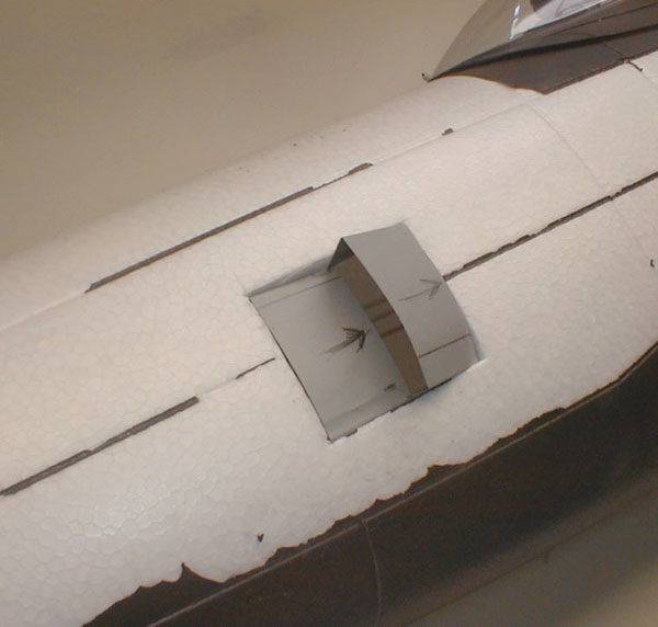 Aluminum litho plate intercooler shutters are epoxied in place after ensuring proper fit. A side benefit is increased cooling for interior parts like battery and ESC by creating an air exit.