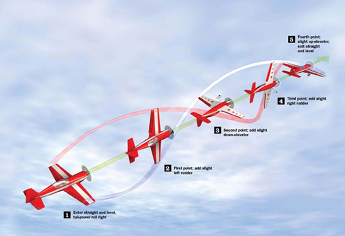 The four-point roll (hesitation roll) is a horizontal roll with a brief hesitation at 90, 180 and 270 degrees. Before you attempt this maneuver, I recommend that you perfect the standard aileron roll by using down-elevator when the plane is inverted. You should be able to do a roll without any altitude loss or heading deviation. It will also help if you can fly knife-edge in both directions.
